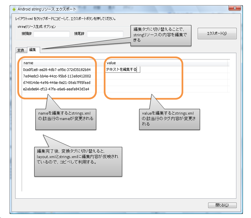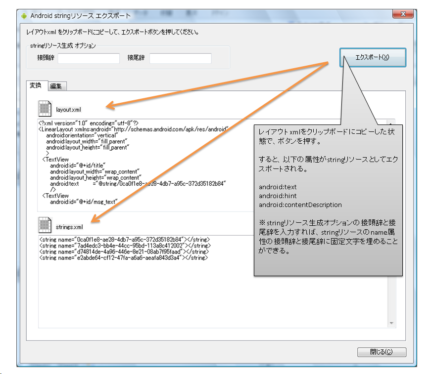 Androidのレイアウトファイルに埋め込まれている生の文字情報を抽出し、編集することができます。